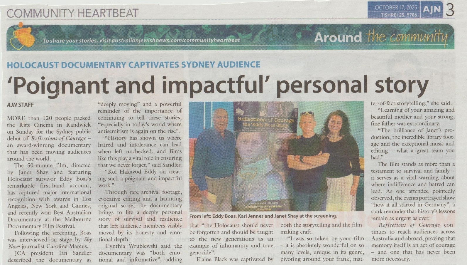 MORE than 120 people packed the Ritz Cinema in Randwick on Sunday for the Sydney public debut of Reflections of Courage – an award-winning documentary that has been moving audiences around the world.